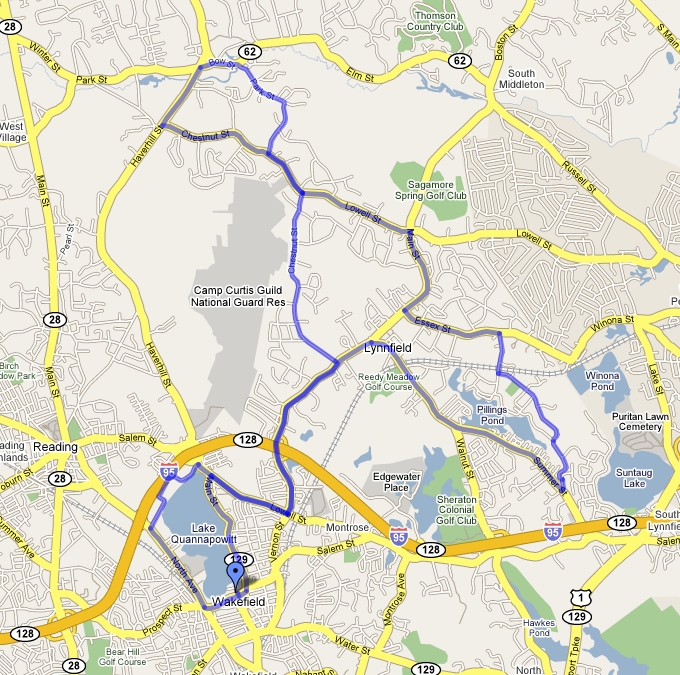 Rte 128 to Exit 40. Follow Rte 129 south (Wakefield) to the south end